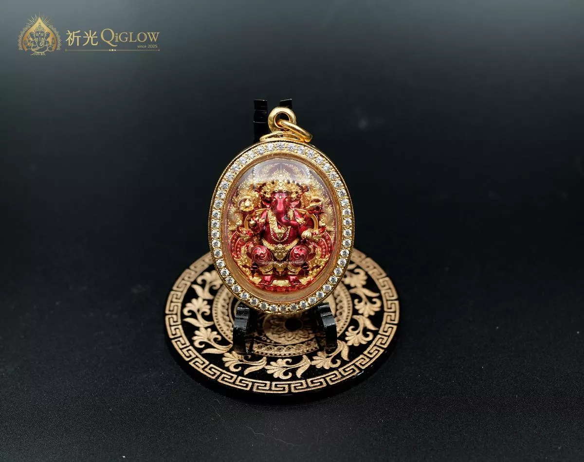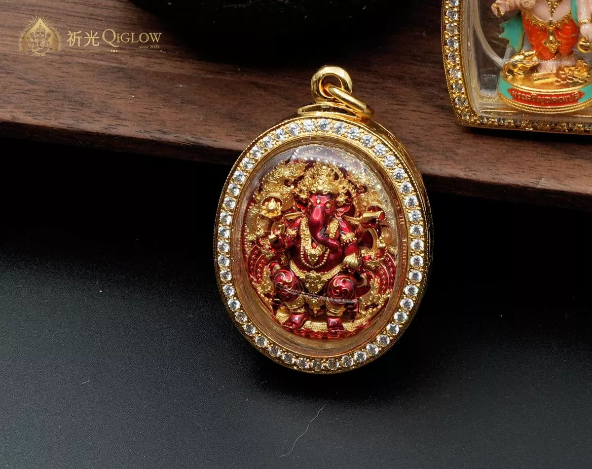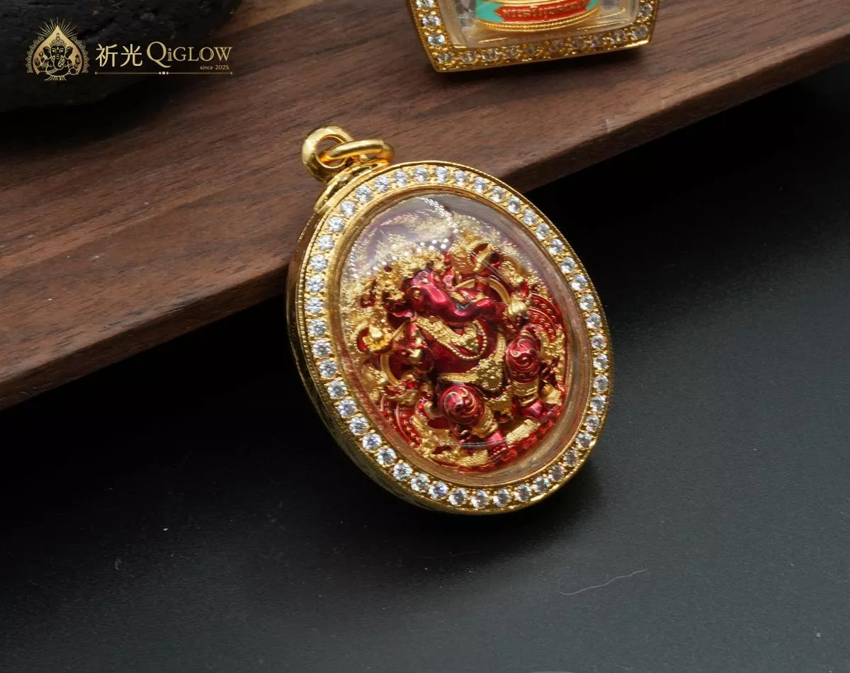 殊勝用料・硃砂紅韻 (Vermilion Power): 結合圖片細節觀察,這尊聖物視覺衝擊力極強。法相採用了象徵生命力與辟邪的硃砂紅 (Vermilion Red) 為主色調,搭配細緻的金漆工藝勾勒神韻,紅金對比展現出無比的尊貴與霸氣。外殼選用高工藝晶鑽防水殼,在光線下熠熠生輝,完美襯托出象神的莊嚴與神聖。