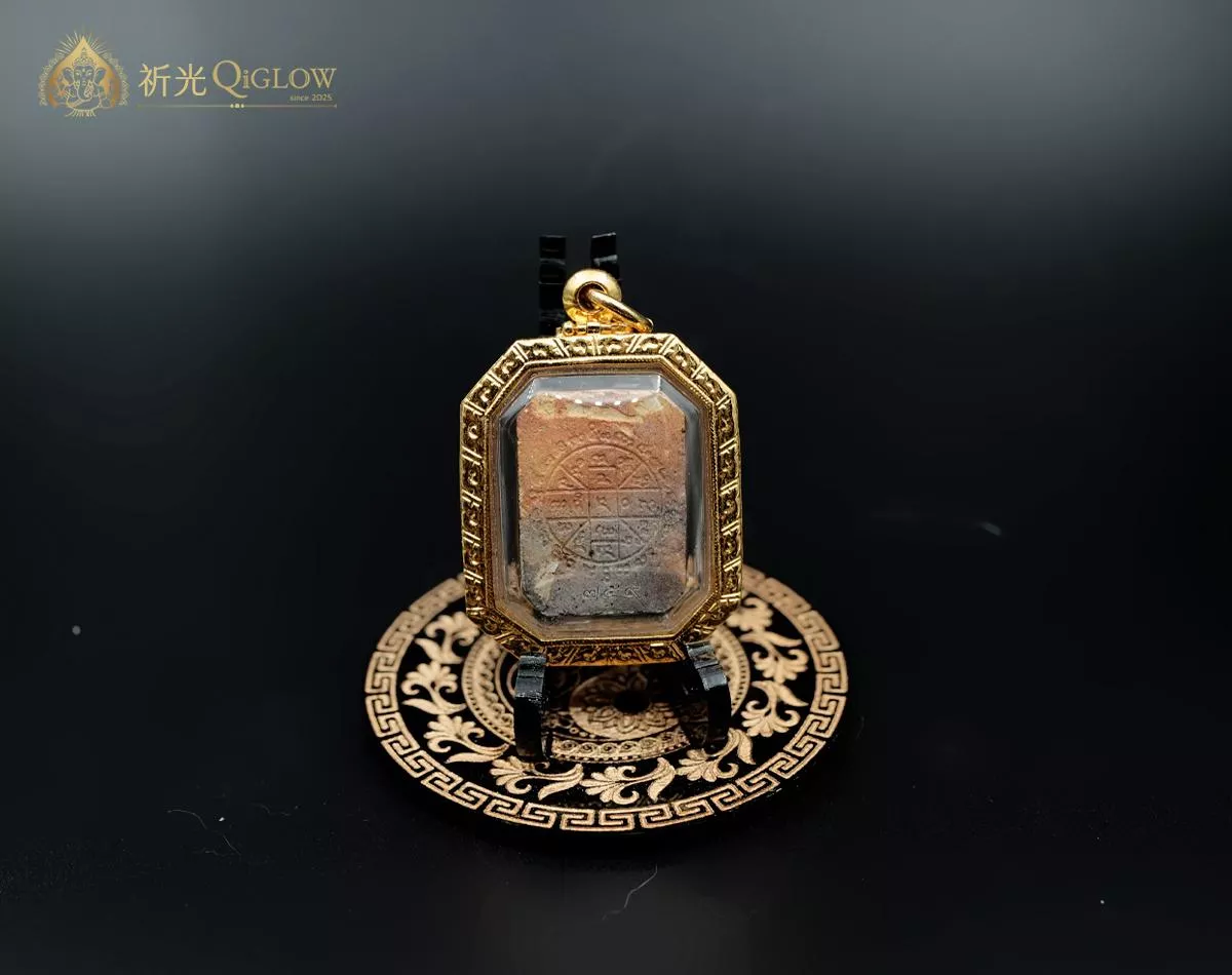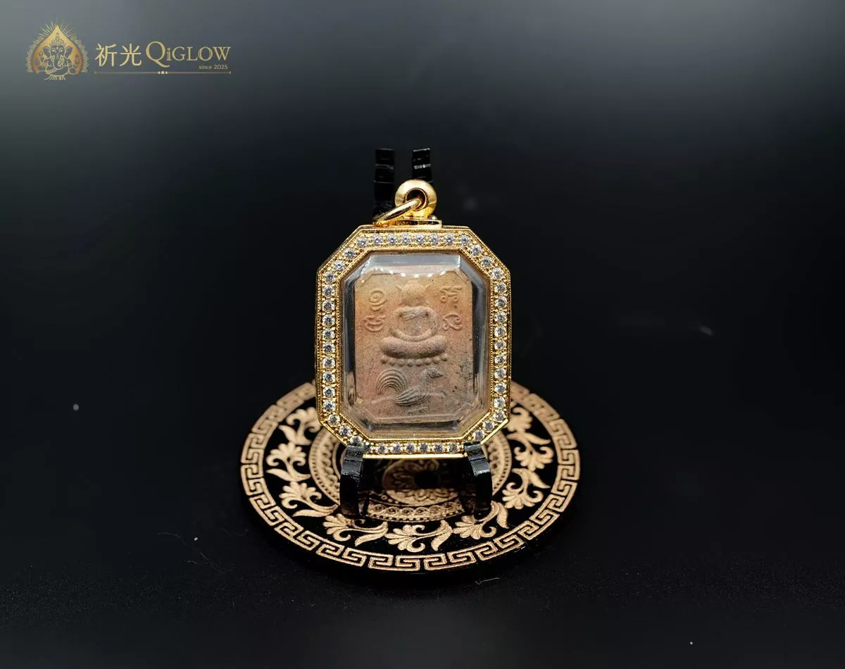 殊勝用料・金甲護身: 這不只是一面普通的崇迪。佛牌正面特別貼有金片盔甲並嵌入符管,象徵刀槍不入的保護與強大的招財磁場;背面則嵌有**「富貴佛」法相,寓意富貴吉祥、財源滾滾** 。