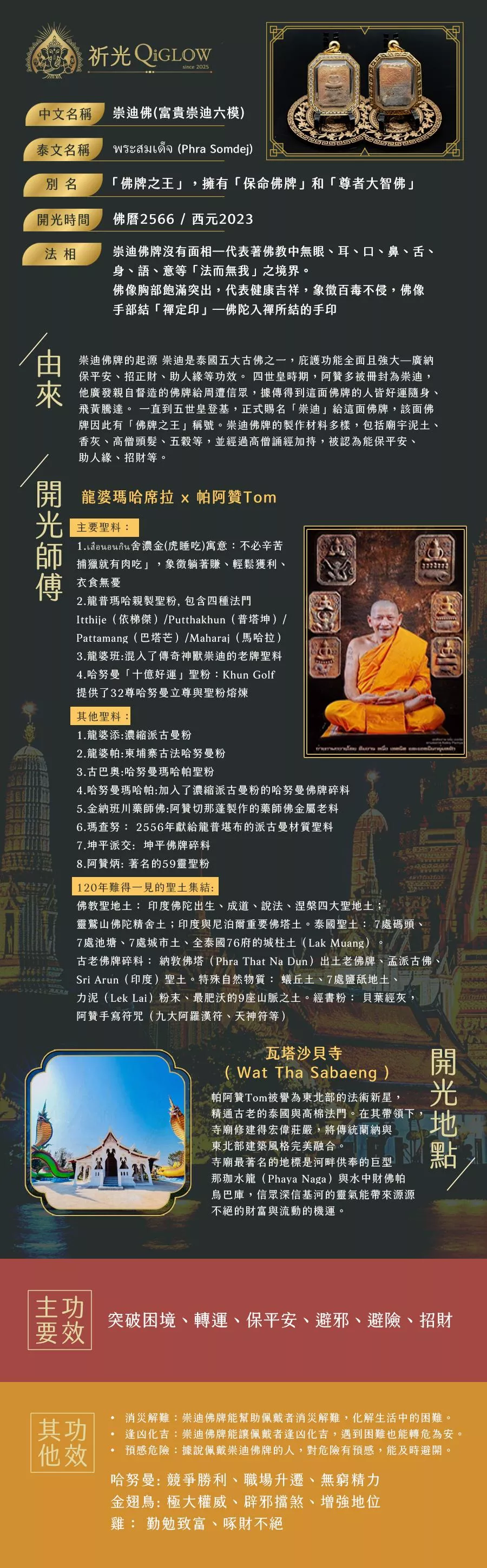 全能功效・佛牌之王: 結合了崇迪佛的保平安、辟邪、擋災 與神獸雞的招財、助事業、好人緣 ,幫助您在險惡的職場中化解小人是非 ,並讓業績蒸蒸日上。