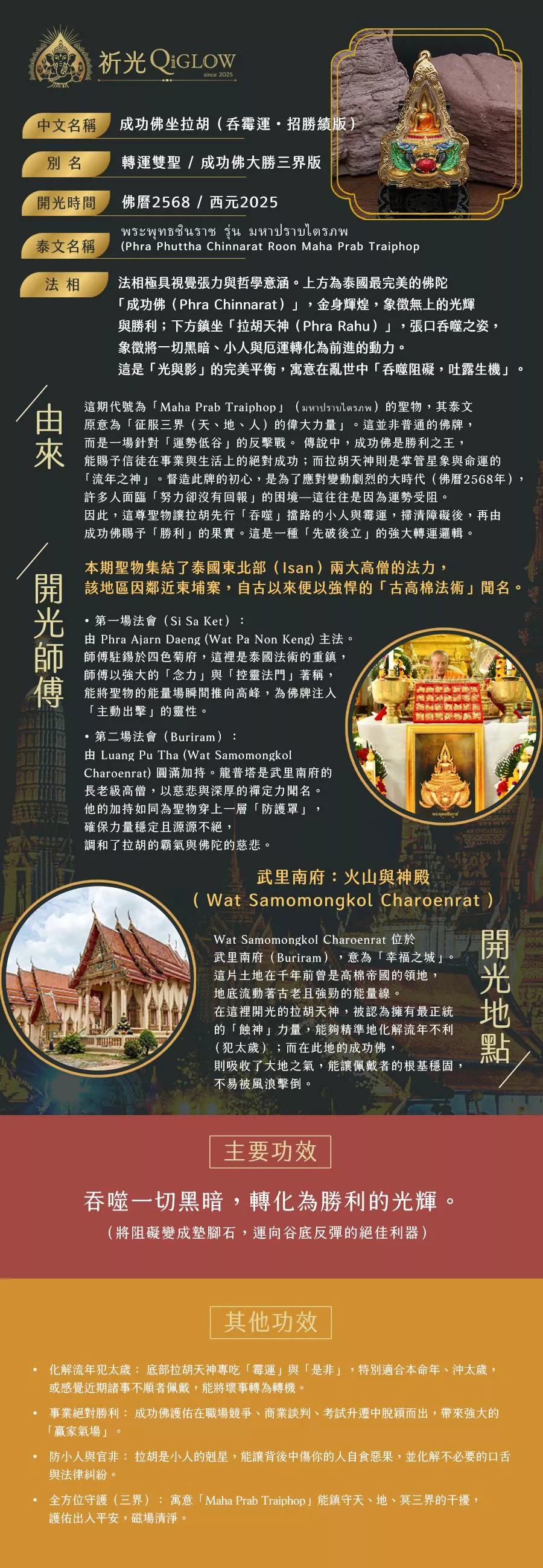 光影平衡・吞噬阻礙 ([Devour Obstacles]): 這期名為「Maha Prab Traiphop」(征服三界)的聖物,完美演繹了「光與影」的平衡哲學。上方是泰國最完美的「成功佛」,象徵無上的光輝與事業的絕對勝利;下方鎮守的是「拉胡天神」,張口呈現吞噬之姿。這並非普通的守護,而是一種「先破後立」的強大轉運邏輯:由拉胡先行「吞噬」擋路的小人與霉運,掃清障礙後,再由成功佛賜予「勝利」的果實。寓意在亂世中,將絆腳石轉化為向上的動力。