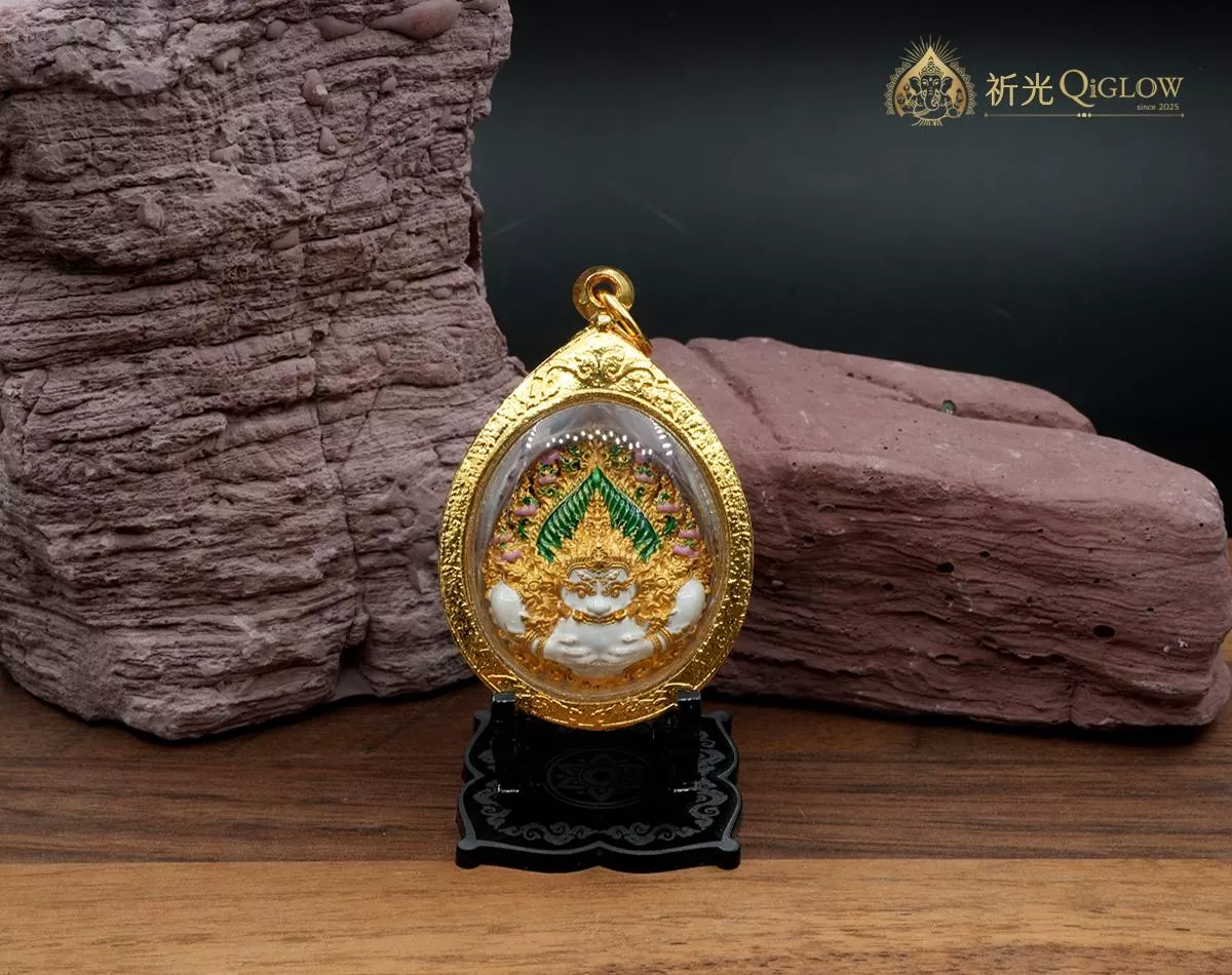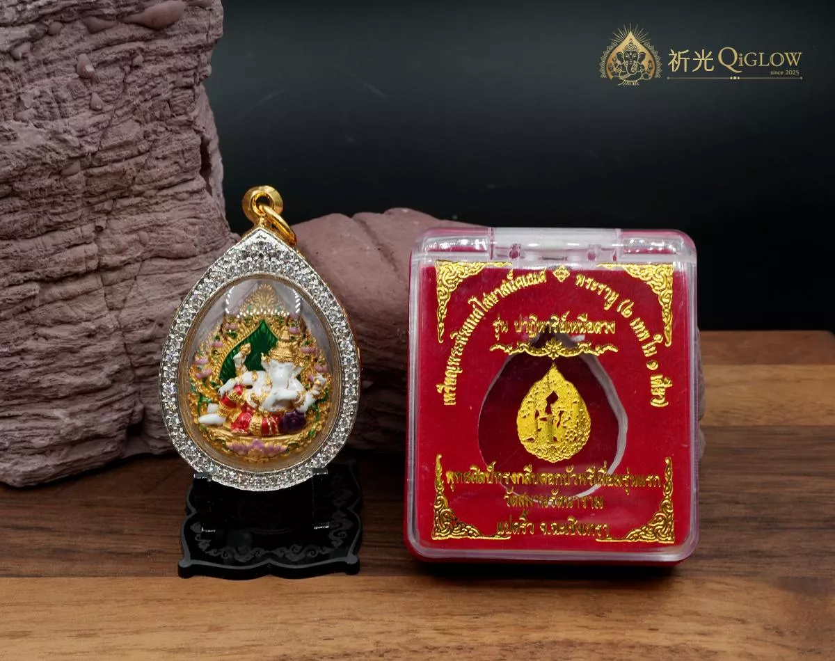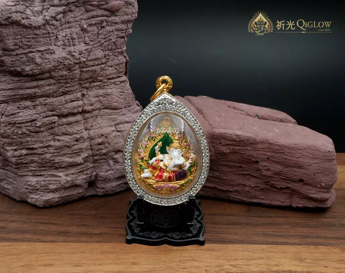 殊勝用料・藝術工藝 (Divine Artistry): 此聖物由全泰國象神能量最集中的聖地——瓦薩曼寺 (Wat Saman Rattanaram) 僧團邀請多位當代高僧聯合開光。視覺上,象神法相採用高雅的白色珐瑯結合金質線條,點綴綠色與粉色聖蓮,展現細膩的泰式宗教美學。佛牌包覆在精緻的鑲鑽防水殼中,搭配原廟精裝盒,無論是日常佩戴還是商務場合,都能展現佩戴者不凡的品味與權威氣場。