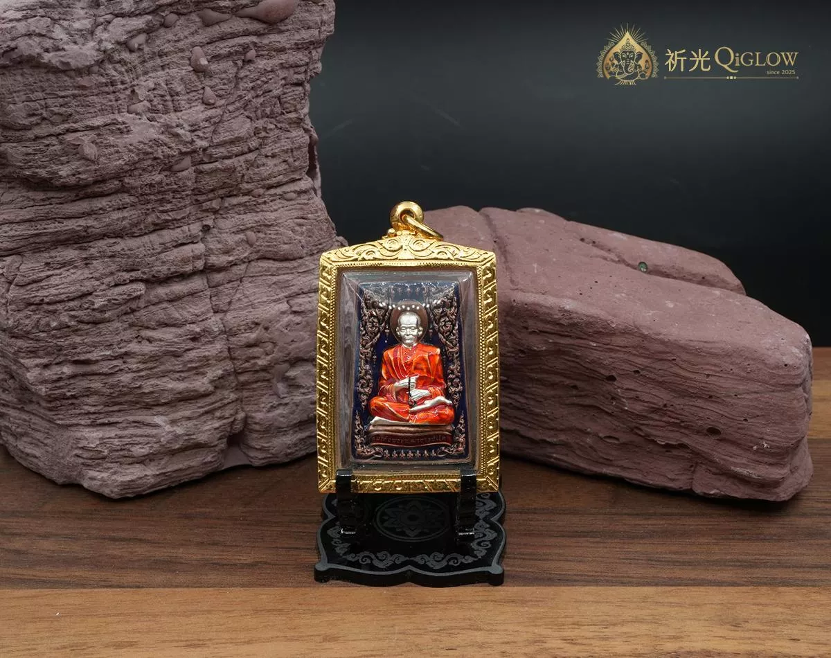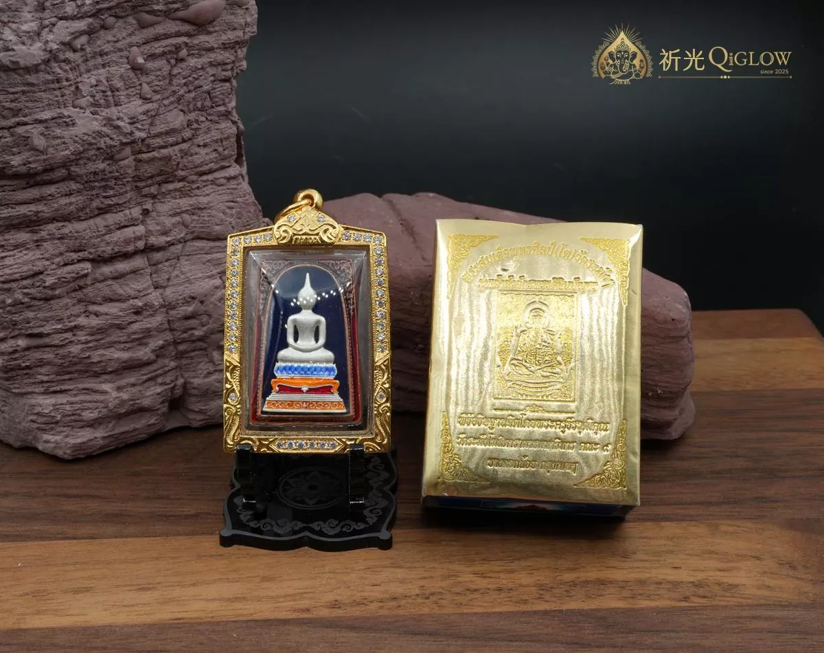 殊勝用料・傳統與時尚的共鳴 (Tradition meets Fashion): 這尊 2567 年的特別版,打破了傳統佛牌「古樸陳舊」的印象。它源自崇迪佛的發源地——瓦拉康寺(Wat Rakang),由地位崇高的現任住持帕貼帕西提坤親手加持,傳承了傳奇祖師爺阿贊多的《金那般川》經文力量。但在視覺上,它大膽採用了**「銀身琺瑯(Longya)」工藝。深邃的寶藍色象徵著智慧與權威,銀色佛身象徵著純潔與財富。搭配閃耀的鑲鑽金殼**,它既是靈性的護身符,也是能展現佩戴者品味的高級珠寶,完美融入商務會議、社交晚宴或日常穿搭。