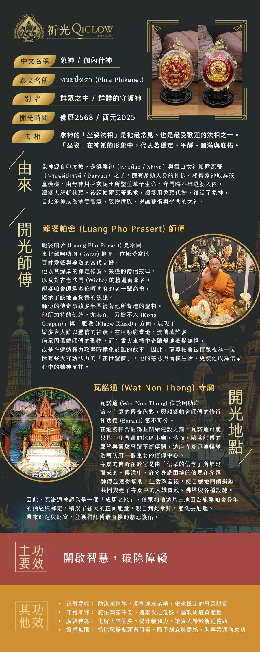 全能功效・成願之地 (Land of Fulfillment): 由龍婆帕舍大師於瓦諾通寺(Wat Non Thong)開光。該寺廟被當地信眾譽為「成願之地」,傳說在此許願極為靈驗。