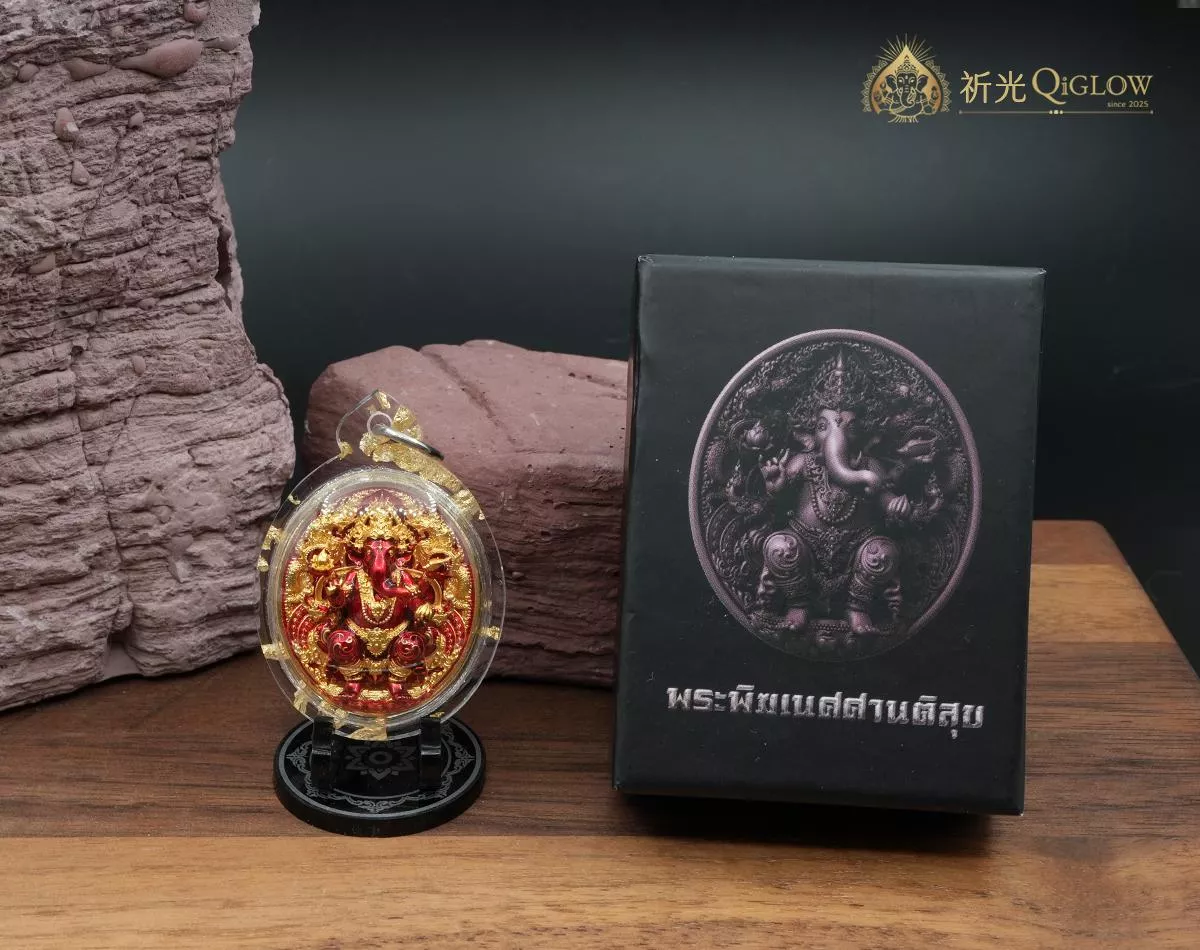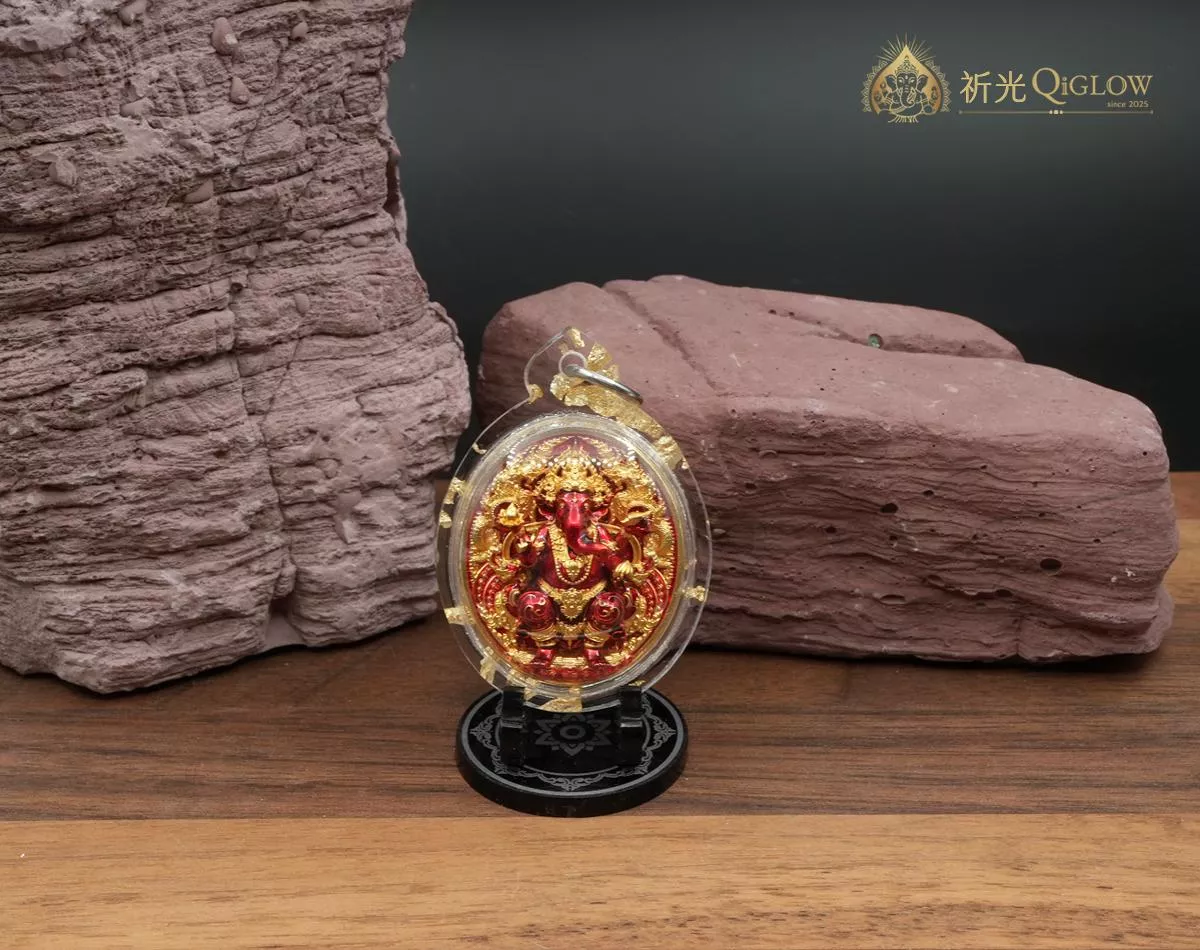 法相寓意・坐鎮安穩 (Stability & Peace): 這尊象神呈現經典的「坐姿」法相,在神祇形象中,坐姿代表著「穩定、平靜、圓滿與庇佑」。祂穩穩地坐在法座上,象徵著在動盪的環境中,佩戴者能擁有一顆安定強大的心,不被困難擊倒。紅色金身的設計更增添了一份積極的「火元素」能量,寓意熱情、行動力與鴻運當頭。