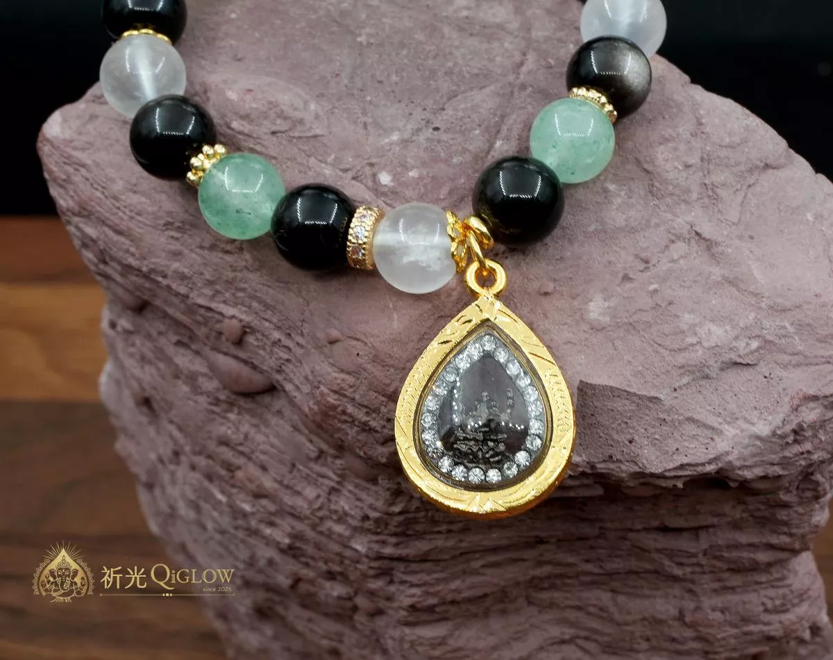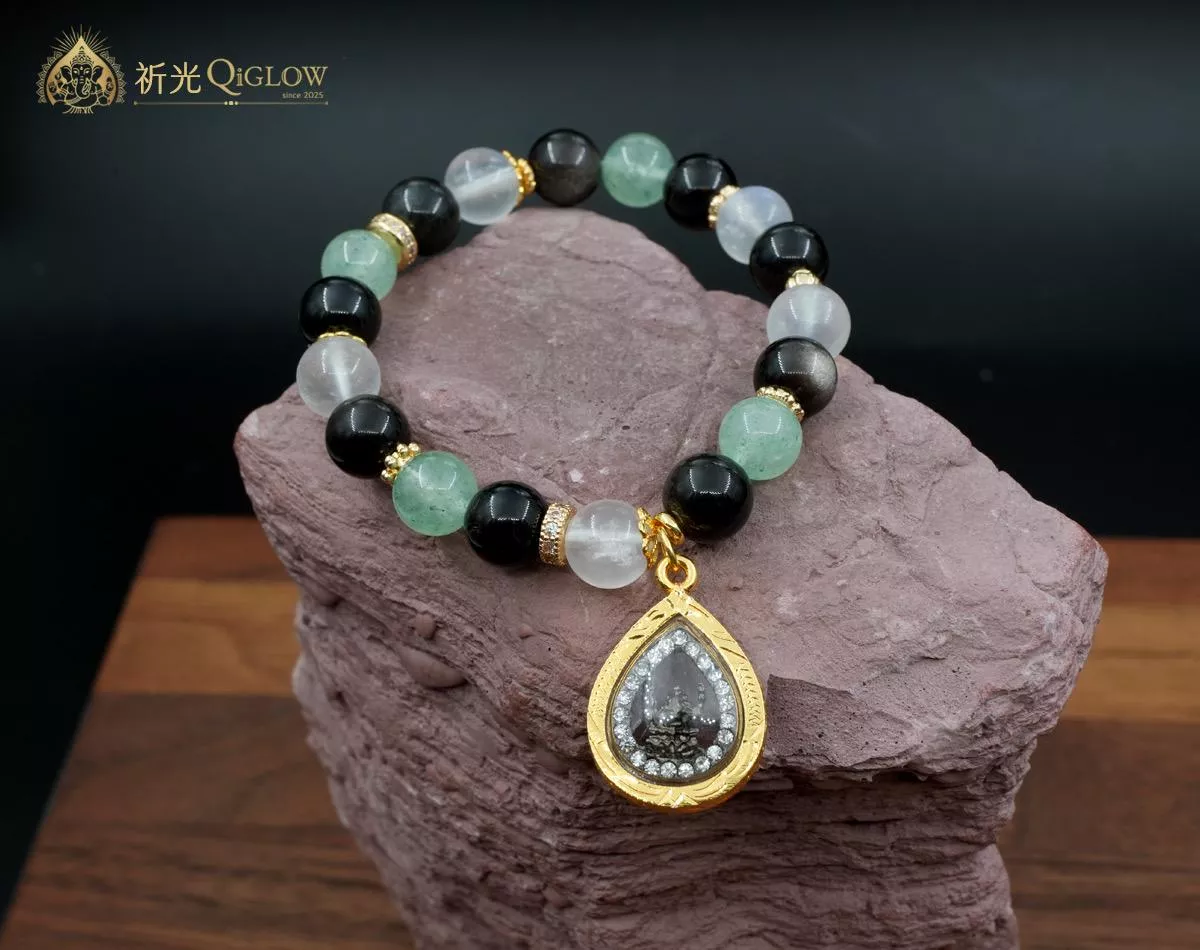 殊勝用料・星塵點點能量: 本款選用色澤溫潤的「綠草莓晶」,其特色在於晶體內散佈著星星點點的礦物內含物,如同草莓果籽般帶有生命力,視覺上呈現出舒適的和諧感。搭配「冰透藍月光」的夢幻暈彩,能柔化氣場;以及帶有銀色流沙光感的「銀曜石」,作為守護能量的基底。整體設計不張揚卻充滿細節,展現低調奢華的質感。