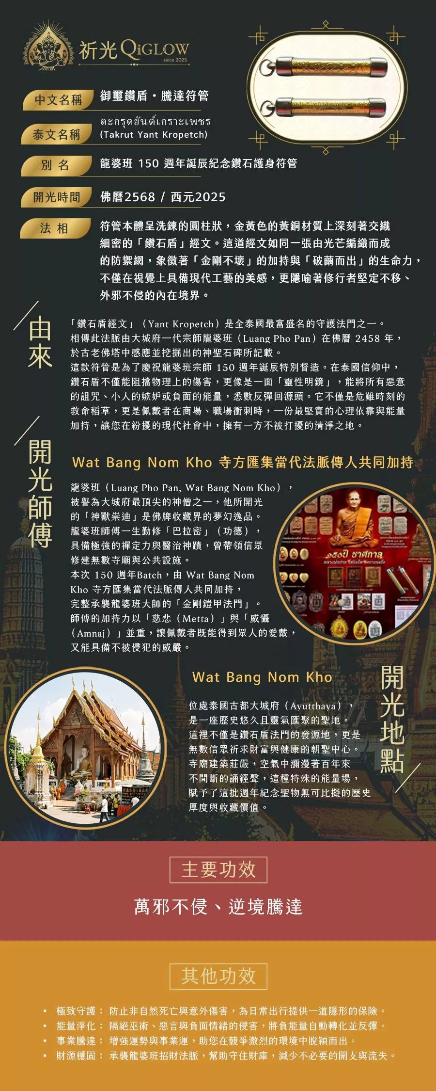 殊勝用料・150週年紀念 (The Legacy): 此為慶祝大城府一代宗師龍婆班誕辰 150 週年的特別督造版本 。由瓦班南科寺匯集當代法脈傳人共同加持,完整承襲了龍婆班大師的「金剛鎧甲法門」 。在充滿百年誦經聲的靈氣古寺中開光,賦予了這批聖物無可比擬的歷史厚度與正統能量 。