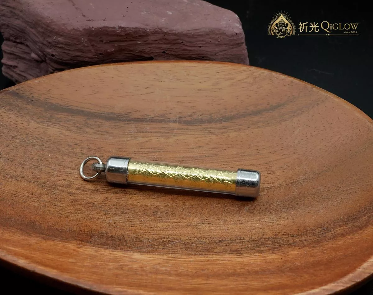 法相寓意・光之防禦網 (Web of Light): 符管表面深刻著著名的「鑽石盾經文(Yant Kropetch)」,其形狀如同一張由光芒編織而成的防禦網 。這源自佛曆 2458 年龍婆班大師於古塔中挖掘出的神聖石碑記載 。它象徵著「金剛不壞」的保護,不僅在視覺上呈現現代工藝的洗鍊美感,更隱喻著佩戴者內心堅定、外邪不侵的強大境界 。