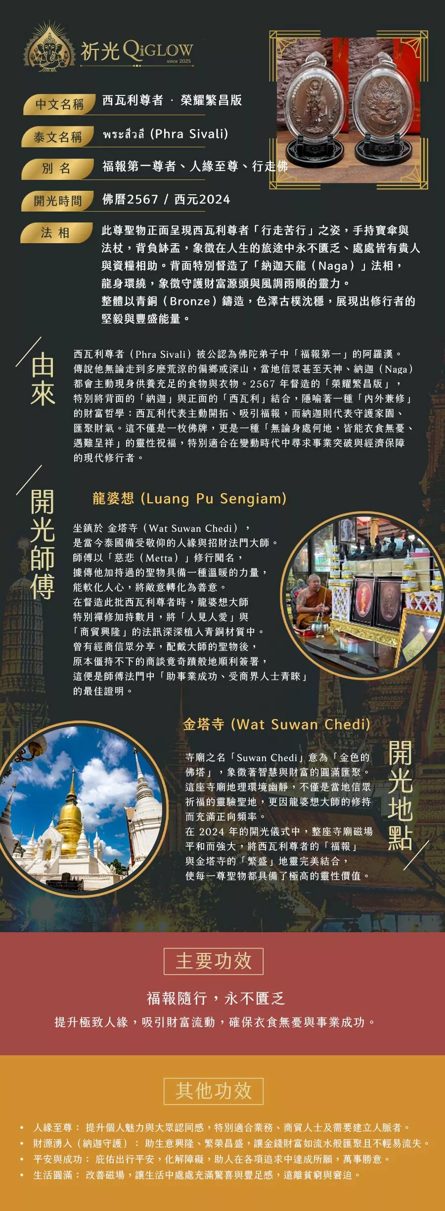 這尊聖物主打「內外兼修」的財富哲學:正面西瓦利代表主動開拓、吸引福報與極致人緣;背面納迦則代表守護家園、匯聚財氣並防止錢財流失。結合龍婆想大師擅長的「慈悲(Metta)」法門,能軟化人心,將惡意轉化為善意,助您在各項追求中達成所願,讓生活處處充滿驚喜與豐足感。