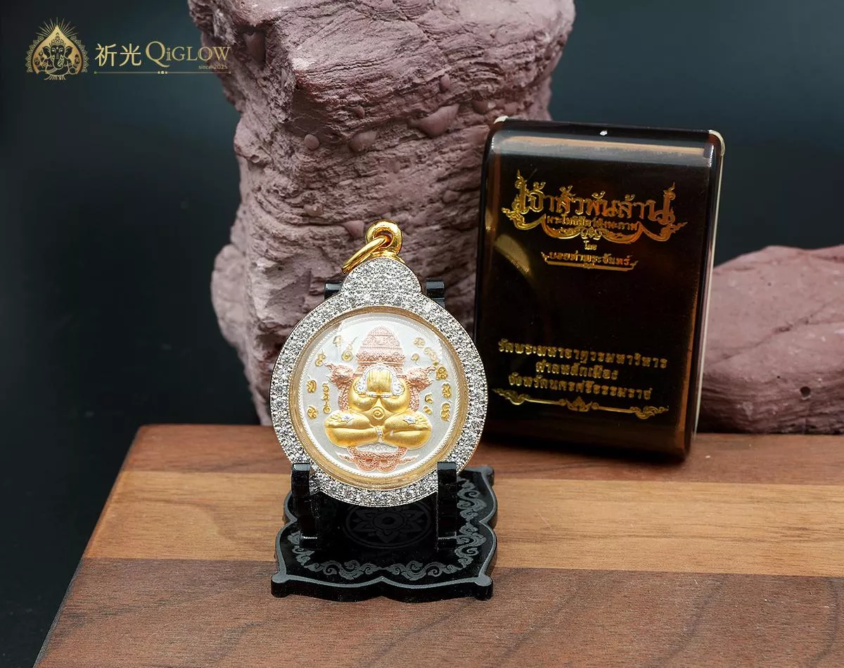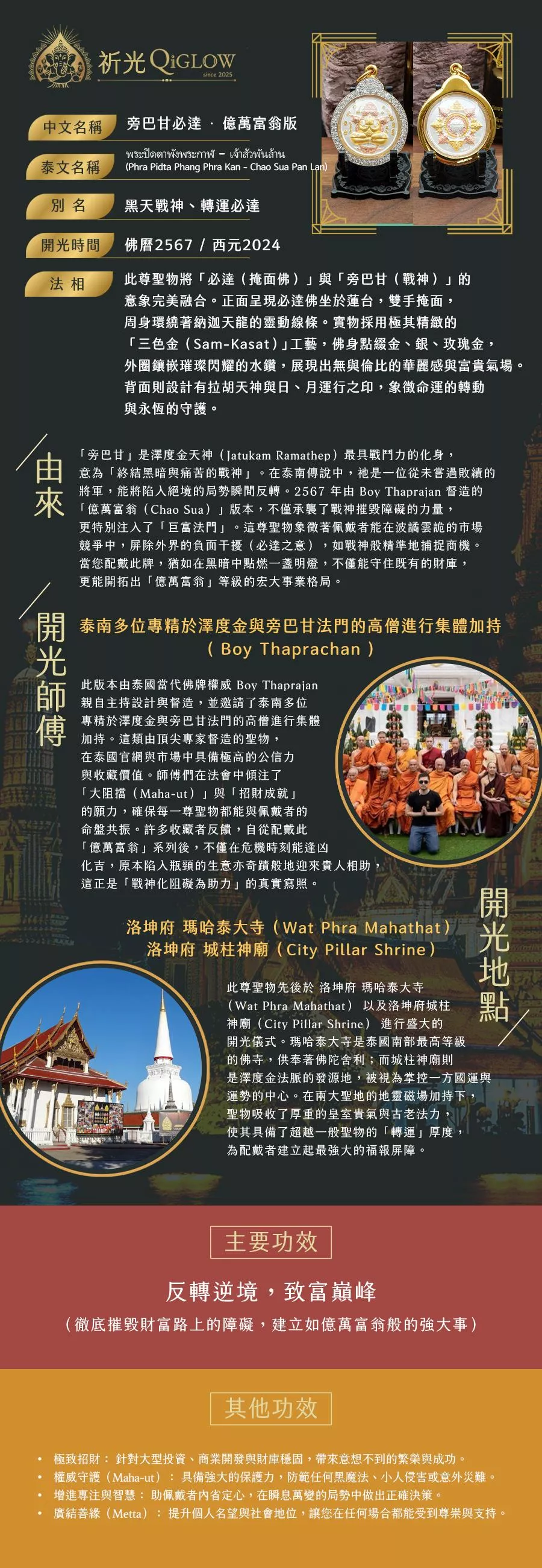 旁巴甘 (Pangpakarn) 是澤度金天神的無敵化身,意為「摧毀黑暗的勇者」。此尊聖物法相呈經典掩面姿態 (必打),象徵屏蔽是非雜念,專注成功。最獨特之處在於其正面法相背後的兩尊騰升巨龍(納迦龍王),如同護法盾牌般環繞守護,寓意在任何挑戰與風雨中,皆能獲得強大的庇佑與資糧支持,無往不利。