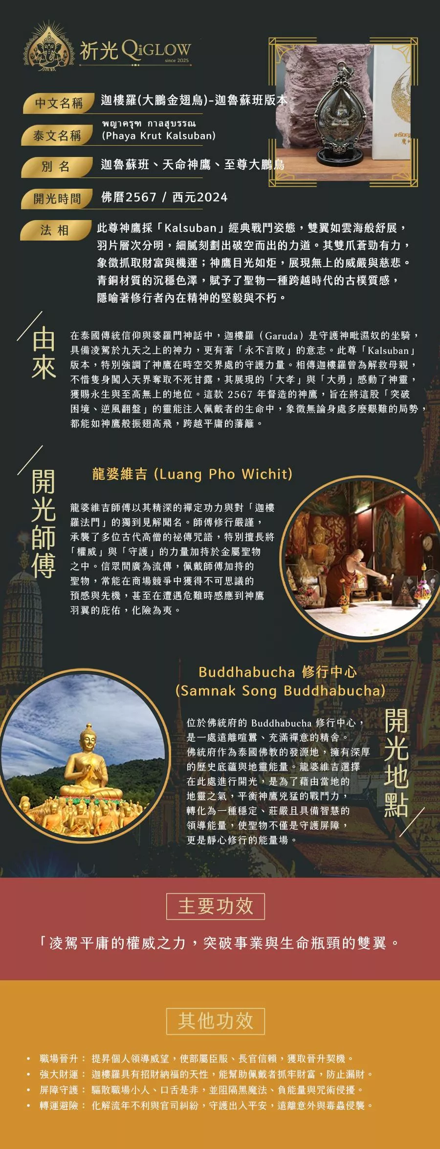 金翅鳥主打「權威之力,突破瓶頸」。能提升個人的領導威望,獲取長官信賴與晉升契機。同時具備強大財運,幫助佩戴者抓牢財富、防止漏財,並能驅散職場小人與是非,化解流年不利與官司糾紛。