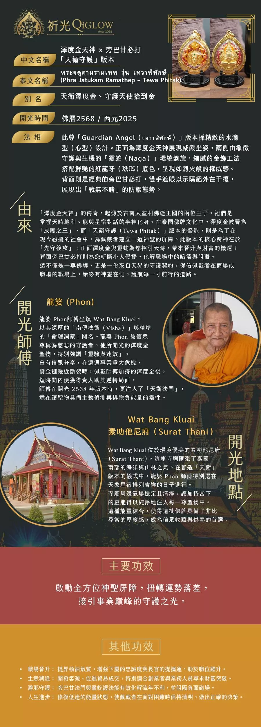 「澤度金天神」的傳奇起源於古南太室利佛逝王國,被譽為掌控天時地利、成願最速的神祇。而「天衛守護 (Tewa Phitak)」版本則是專為現代高壓社會打造的「先守後攻」配置:正面澤度金與靈蛇為您引領天時,接引財富與升遷機運;背面旁巴甘必打則隔絕外界干擾,化解職場背後的暗箭與阻礙,是一份來自天界的強大守護契約。